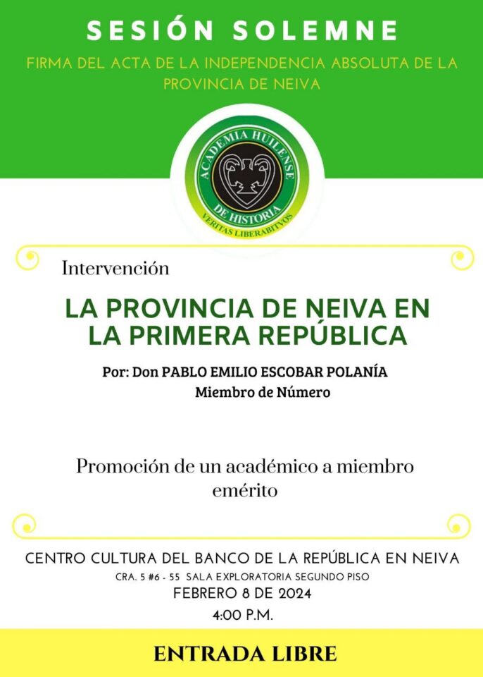 Conferencia impartida por Don Pablo Emilio Escobar Polanía durante la Sesión Solemne de la Academia Huilense de Historia, celebrada el 8 de febrero de 2024 en el Centro Cultural del Banco de la República de Neiva, para conmemorar la firma del Acta de la Independencia Absoluta de la Provincia de Neiva.
