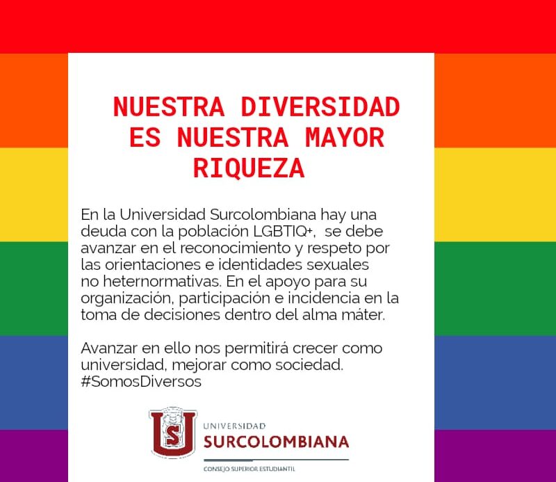 La universidad Surcolombiana no es monocromática, tiene matices: diversas identidades género, orientaciones sexuales y apuestas estéticas no hegemónicas. De ahí la importancia de proponer la creación y materialización de una Política institucional de diversidades sexuales y de género en la USCO.