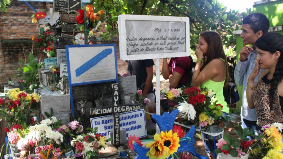 Mientras caminábamos rumbo hacia la parte trasera del cementerio, vimos un hombre con apariencia de homosexual llorando en una tumba, muy afectado emocionalmente. Caminamos callados y encontramos en la parte derecha la tumba del famoso Saúl Quintero, un bandolero conservador de la década del 50, que por su carácter de colaborador social, se convirtió después de muerto en un hombre enigmático al cual personas de distintas partes de país vienen a pedir favores o agradecer por supuestos milagros. Su tumba esta entre árboles y parece en verdad un mausoleo lleno de pequeñas lapidas de agradecimiento. Cuando llegamos yo tomé algunas fotografías, mientras mis compañeros leían algunas de las lapidas…pero había un olor fétido que afectada a cualquiera. Leyeron con la nariz tapada y salimos muy rápido del lugar, más hacia el fondo buscando la tumba de la adinerada familia Perdomo, que finalmente encontró un compañero; para desgracia nuestra el agua estancada cubría muchas tumbas en el rincón.