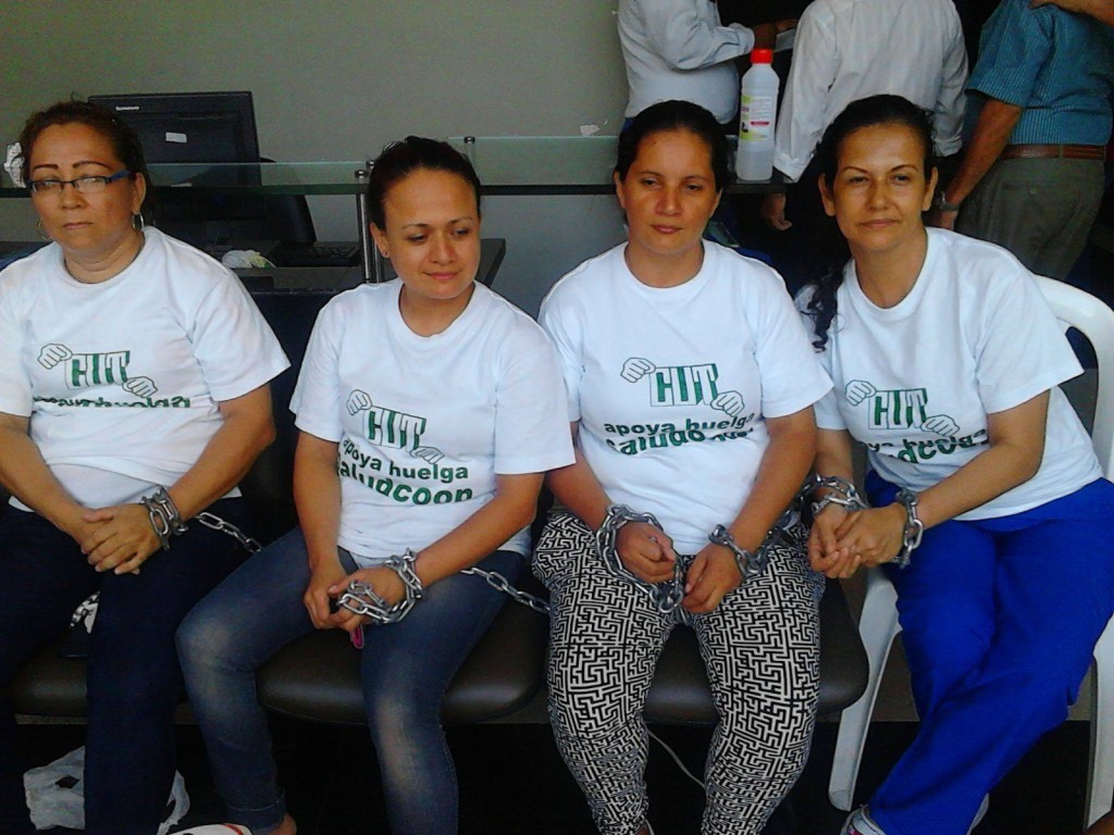 Una cadena gruesa que pasa por las manos de cinco trabajadoras de la extinta clínica Saludcoop, simboliza la unidad ante el desespero que las embarga al no saber su futuro laboral. Se trata del segundo grupo de empleados que se han declarado en huelga de hambre.