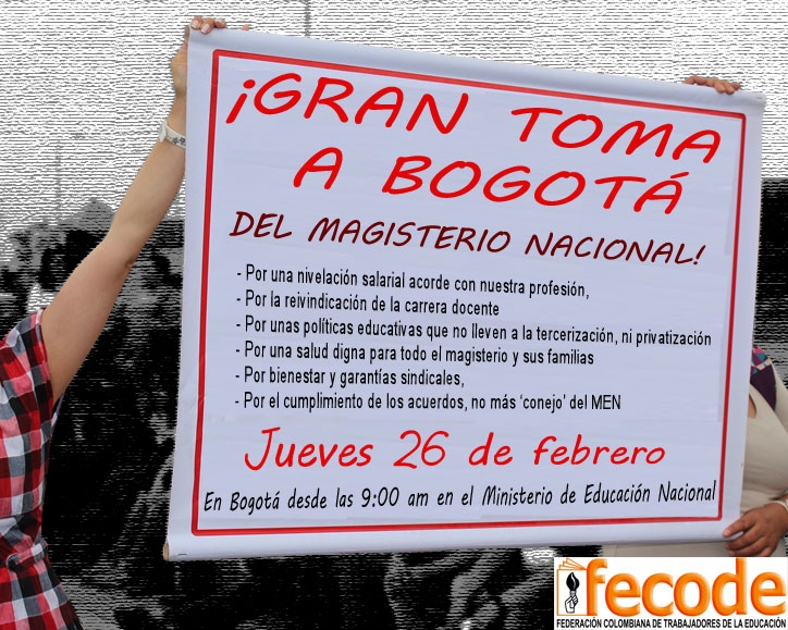 La organización sindical espera que maestros y maestras de todo el país se sumen a la movilización en respaldo el pliego de peticiones que será radicado ante el Ministerio de Educación Nacional. La nivelación salarial, la reivindicación de la carrera docente, políticas educativas que no lleven a la tercerización y privatización, salud digna para los maestros y sus familias, bienestar y garantías sindicales, y el cumplimiento de acuerdos anteriores por parte del MEN, son las reivindicaciones consignadas en el documento construido por FECODE. (Ver: Pliego de Peticiones).